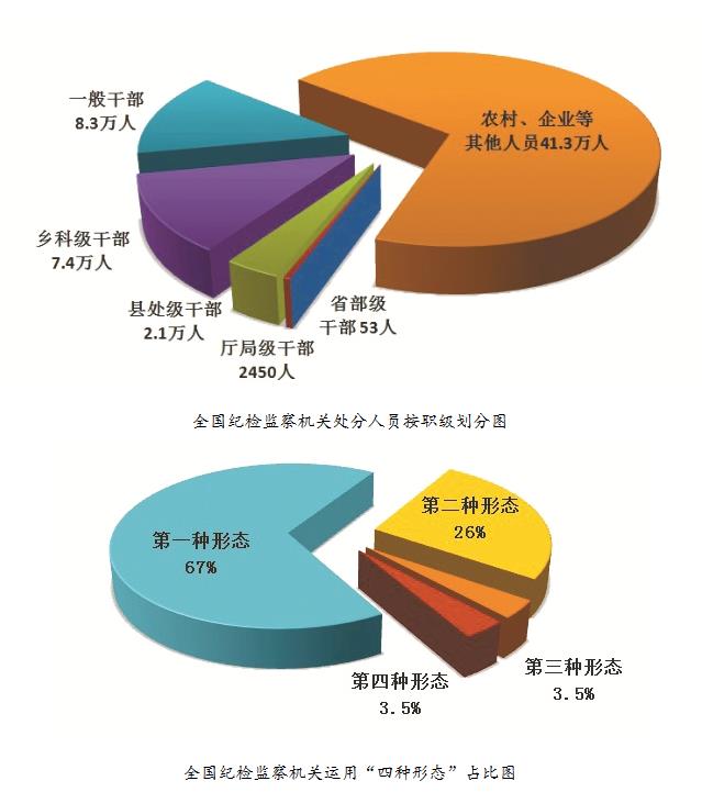 2022年,全國紀檢監察機關共接收信訪舉報344.4萬件次,其中檢舉控告類信訪舉報104.4萬件次。處置問題線索154萬件,談話函詢32.5萬件次,立案59.6萬件,處分59.2萬人(其中黨紀處分48.9萬人、政務處分14.9萬人)。處分省部級干部53人,廳局級干部2450人,縣處級干部2.1萬人,鄉科級干部7.4萬人,一般干部8.3萬人,農村、企業等其他人員41.3萬人。