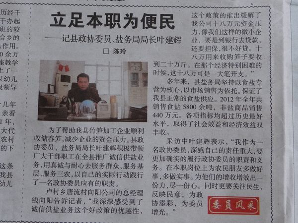 盧村鄉唐流村向陽公司的總經理錢向陽告訴記者,“我深深感受到了誠信供鹽業務這個好政策的優越性,這個政策的推出緩解了我公司十八萬元資金壓力,像我們這樣的微小企業,要是到銀行去貸款,還要擔保,很不好貸。十八萬用來收購筍子要收到二十萬斤。在那個經濟特別困難的時候,這十八萬可是一大筆開支。”