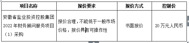 1.項(xiàng)目名稱:安徽省鹽業(yè)投資控股集團(tuán)2022年財(cái)務(wù)顧問(wèn)服務(wù)項(xiàng)目(1)